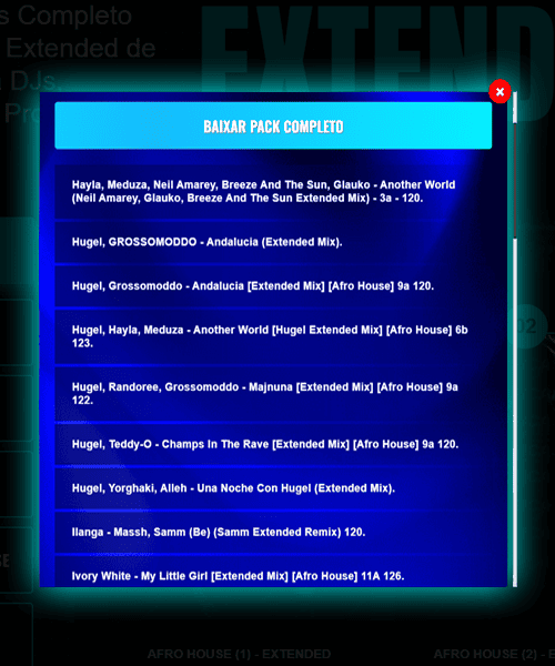 São mais de 08 mil Músicas Extended + 1000 samples, loops, mashups e acapellas. Tudo organizado por gênero e atualizado direto no painel.